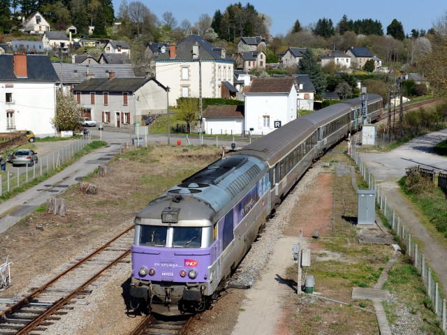| Commentaire image : L'ancien PN 64, à Ussel, est vu depuis le pont-rail qui l'a remplacé vers 1970. L'atmosphère printanière du cliché ne doit pas faire oublier que cet Intercités Clermont - Bordeaux du dimanche est à l'automne de son existence. | ![]() |