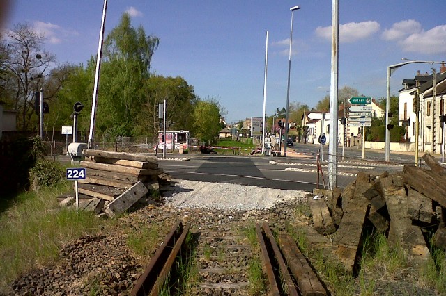 Commentaire photo - Ce passage à niveau se situe en plein carrefour, mais, ici, les trains ne constituent plus une gêne. La gare de Montluçon se situe vers la gauche. | |