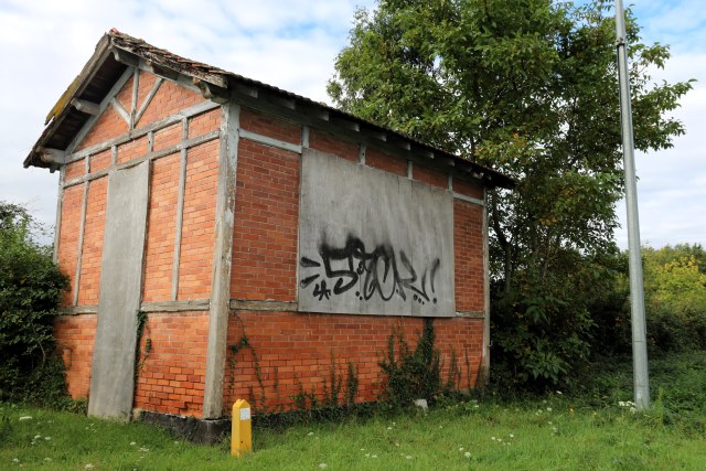 | Commentaire image : Située sur une parcelle liée au chemin de fer dans le quadrant sud-ouest du passage à niveau, cette construction intrigue. Elle paraît postérieure à la mise en service de la ligne, opportunément édifiée en brique, dans un secteur au sous-sol riche en argile. Il pourrait s'agir d'un dépôt attaché à un trafic local suffisamment important pour justifier son implantation. | ![]() |