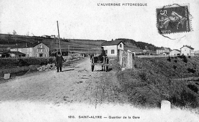 Commentaire image : Au début du XXème siècle, la route est encore un espace de lenteur et de convivialité : la vitesse est née avec le chemin de fer, qui n'en gardera pas le monopole. La gare de Saint Alyre d'Arlanc se déploie à droite de la maisonnette, dont le repère de nivellement indique 849, 038 m.. | ![]() |