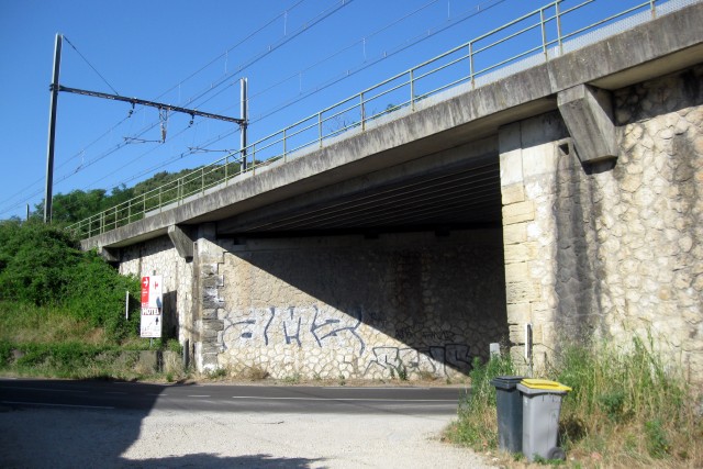| Commentaire photo - L'ouvrage, vu en direction de la gare voisine de Lafoux les Bains et de Nîmes, prolonge le grand pont sur le Gardon, situé vers la droite. Avec ses poubelles, ses tags, son panneau publicitaire et sa corniche en béton, cette "porte d'entrée" dans Remoulins n'est pas à la hauteur du Grand Site du Pont du Gard tout proche. | |