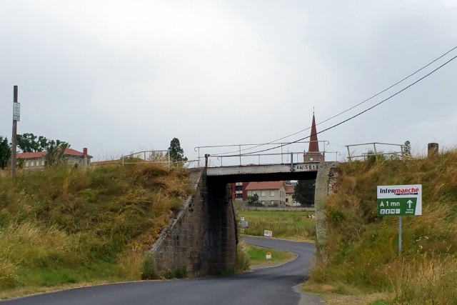 | Commentaire photo - L'Intermarché Contact, annoncé "à 1 mn", se situe juste au-dessus de la gare d'Usson_Saint Pal. Le clocher de l'église paroissiale, qui semble percer le tablier, a été construit en 1601. A gauche, en direction de Sembadel, le panneau annonce le PN 123. | |