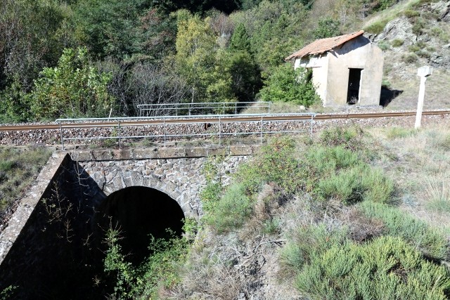 | Commentaire photo - Juste en amont du pont, l'ancien poste de block achève de se décomposer, tandis que le logement des agents a disparu dans la végétation. | |