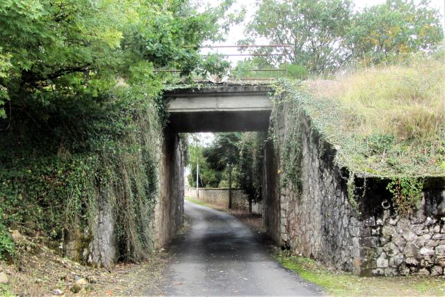 | Commentaire photo - Ici comme ailleurs, les culées ont été "taillées" pour la double voie : la Compagnie avait vu grand. Vers la droite, en direction d'Angoulême, le pont sur la Tardoire marque l'ancienne limite communale entre la Rochefoucauld et Saint Projet Saint Constant. | |