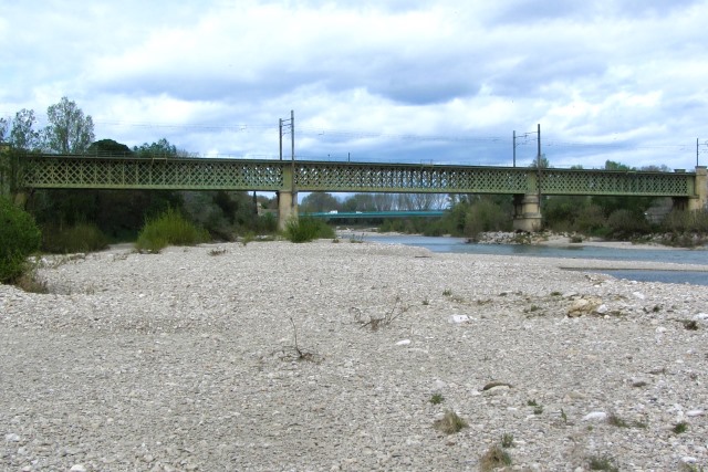| Commentaire image : L'ouvrage, vu vers l'amont, a été sérieusement bousculé par la crue centenale de septembre 2002, occasionnant une coupure de la ligne longue de plusieurs semaines. Au fond, on aperçoit le pont routier de 1994, descendant coloré du pont suspendu de 1830 édifié par les frères Seguin, lui-même successeur d'un antique Pont Romain. | ![]() |