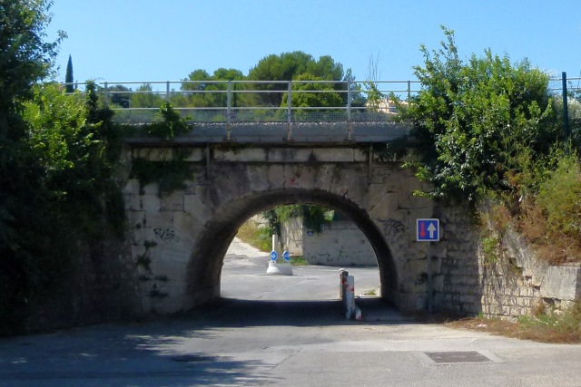 | Commentaire photo - Aucun panneau ne précise la hauteur maximale de ce pont-rail : 1,80 m. Le passage à droite oblige les piétons à courber la tête. L'arc historique supporte un tablier élargi sur des consoles. La direction de Tarascon est à droite. | |