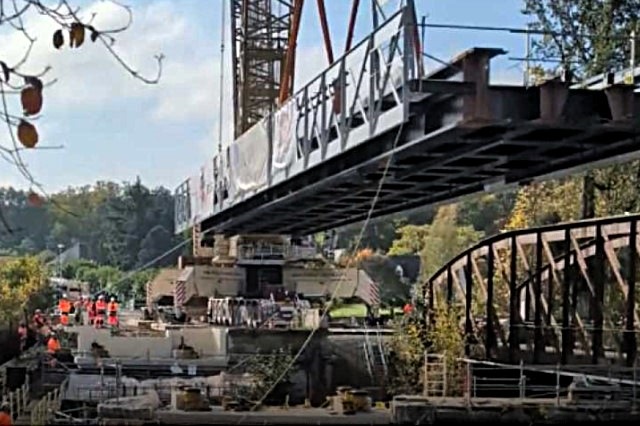 | Commentaire photo - Le nouveau tablier de 200 t, réalisé par l’entreprise Baudin Châteauneuf, est en cours de pose au moyen d'une grue géante. L'ouvrage visible en aval est celui de l'ancienne ligne départementale vers Ligueil. Il est franchi de nos jours par le GR 46. | |