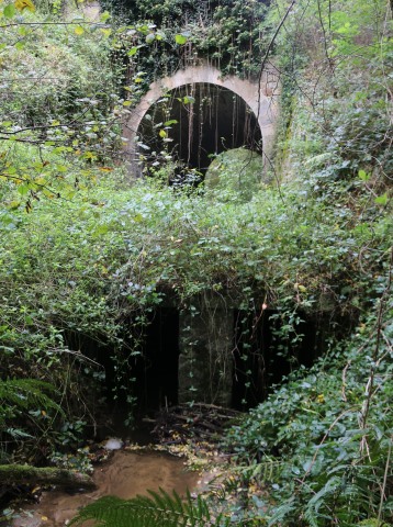 | Commentaire photo - Un ouvrage supérieur laisse passer un chemin qui recouvre un double aqueduc à travers lequel s'écoulent les eaux du Néron, un ruisseau qui semble n'avoir rien d'impérial. La direction de Thiers est à droite. | |
