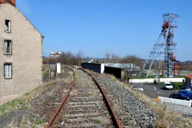 Commentaire photo - Tandis que les rails inutiles filent au nord en direction de l'usine Rockwool visible au-delà des haies, le chevalement du Puits Saint Joseph est devenu l'emblème de la Maison de la Mine et du Tourisme, ouverte à proximité en 2011. | |