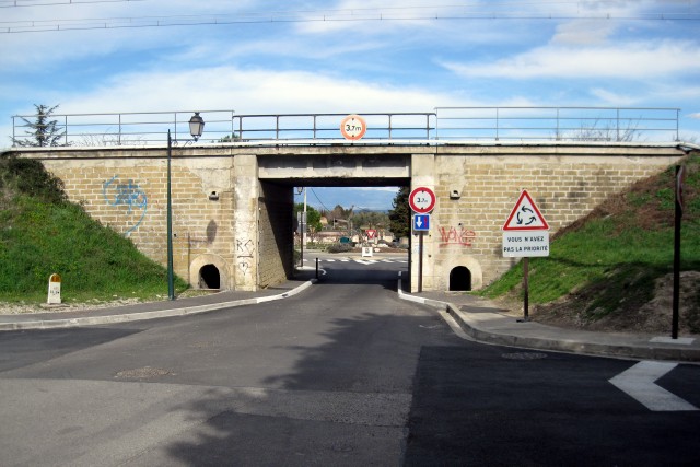 | Commentaire photo - La ligne d'Avignon à Miramas a ceci de particulier qu'elle suit deux très anciens cours opposés de la Durance, quand celle-ci se jetait dans l'Etang de Berre d'une part, d'autre part quand elle rejoignait le Rhône au nord d'Avignon et qu'elle arrosait le territoire de Jonquerettes. On notera les deux aqueducs qui percent les culées d'un ouvrage qui n'est plus adapté à la circulation d'une cité ayant, en un demi-siècle, sextuplé sa population. La direction de l'Isle sur la Sorgue est à droite. | |