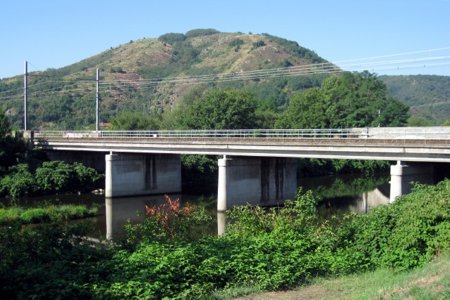 | Commentaire photo - Ce pont, manifestement pas d'origine, précède le confluent du Rhône et de la Cance, dont le cours délimite les communes d'Andance au nord et de Sarras au sud. Il est dominé par une croupe où la roche affleure : le flanc oriental du Massif Central. La direction de Nîmes est à gauche. | |