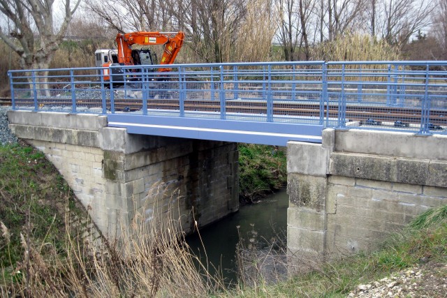 Commentaire photo - Le nouveau tablier est de type ballasté. Ses parties métalliques ont été parées d'un bleu lilas très seyant. La direction de Carpentras est à droite. | |
