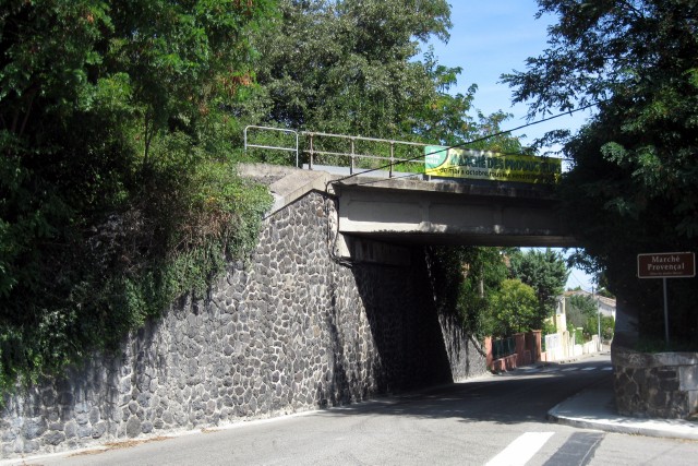 | Commentaire photo - Des milliers de véhicules et de poids-lourds se croisent chaque jour sous cet étroit pont-rail. C'est dimanche, qui plus est l'heure de l'apéritif : le photographe a pu profiter d'une "fenêtre" de quelques secondes sans circulation. La direction du Teil-gare est à droite. | |