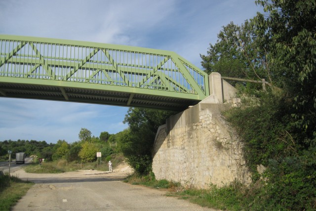 | Commentaire photo - Une culée mira-culée supporte la longue passerelle du tronçon le plus ancien de la Voie Verte du Pont du Gard, qu'empruntent également les GR 6 et 42. A gauche, on aperçoit l'itinéraire de rocade très apprécié des camions porte-conteneurs quittant ou rejoignant Fos sur Mer. La direction de la bifurcation de Saint Montant, à Beaucaire, est à droite. | |