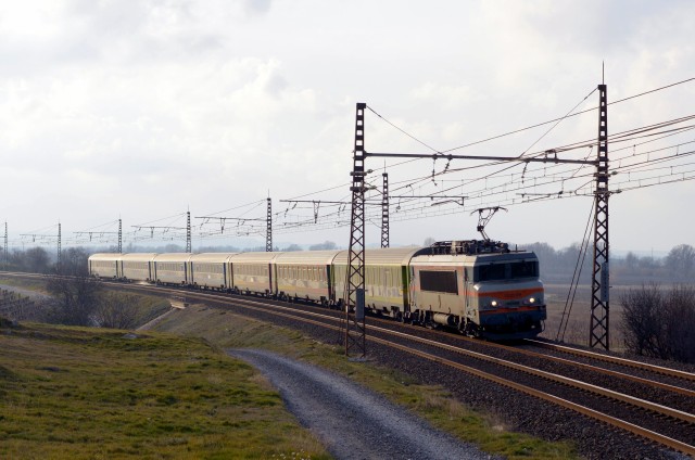 | Commentaire photo - Ces deux poteaux en vis-à-vis forment un arc de triomphe pour cet ex-Téoz, qui ne le mérite peut-être pas : à l'intérieur, la plupart des équipements sont déglingués, quand ils ne sont pas hors service, tandis qu'à l'extérieur, la couche de crasse recouvrant les voitures risque d'engager le gabarit. Les Intercités de la Transversale Sud en provenance de Bordeaux sont condamnés, comme les TGV intersecteurs empruntant la LGV Méditerranée, à ne plus dépasser Marseille : parmi les causes, une régularité impossible à assurer sur les longues distances. Nice et la Côte d'Azur constituent des destinations manifestement abandonnées à l'avion. La direction de Toulouse est au fond. | |