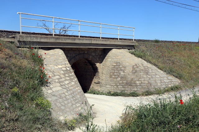 | Commentaire image : Le pont des Mouraillets, vu en plan rapproché, se situe entre les deux stations que comptait la commune de Névian : à l'ouest, au lieu-dit Laparre, la gare de "Villedaigne" et, à l'est, au PN 266, la halte, sans doute tardive, de "Névian". | ![]() |