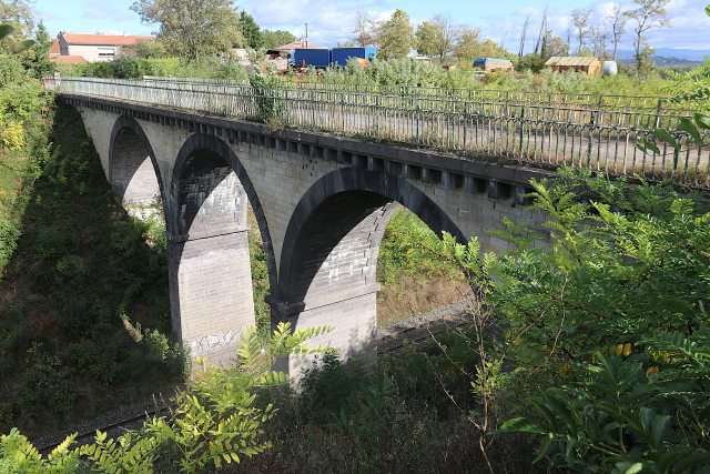 | Commentaire photo - Cet ouvrage cache ses arches, comme si elles étaient trop belles pour le commun des mortels. Au loin, vers l'est, se dresse la ligne vaporeuse du Livradois, obstacle naturel entre les plaines de la Limagne et du Forez. | |