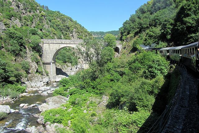 | Commentaire photo - A droite, un "Train des Gorges" se laisse descendre jusqu'à son terminus de Tournon_Saint Jean. | |