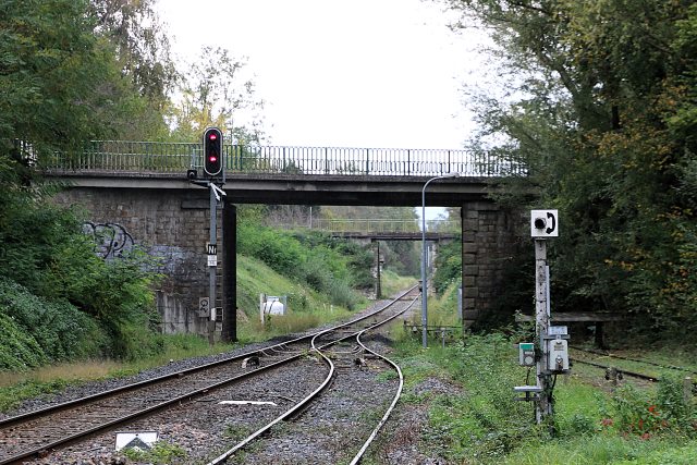 | Commentaire photo - De gauche à droite on distingue : la cible du BAPR, la voie principale, la voie d'évitement, et l'extrémité de l'embranchement Saipol. | |