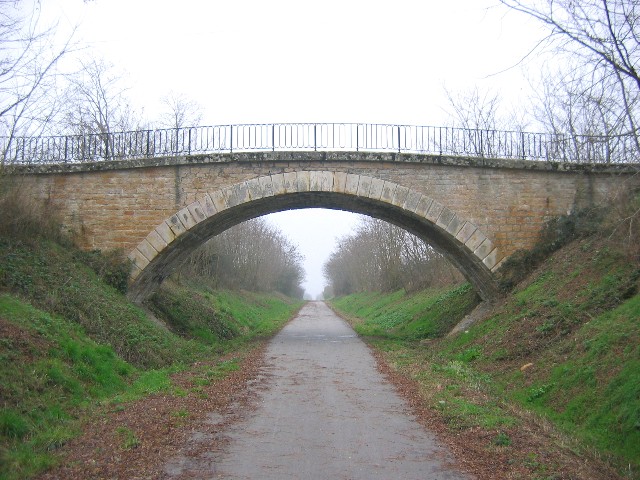 | Commentaire photo - Un pont en arc, cela fait toujours plaisir à voir. Celui-ci est resté dans son jus, pierres et gardes-corps, et domine la plate-forme en rampe vers Givry, encadrée par deux talus boisés. Les feuilles mortes en décomposition mangent déjà la Voie Verte toute neuve, qui, faute d'entretien, pourrait être moins pérenne que son aînée la voie ferrée.. | |