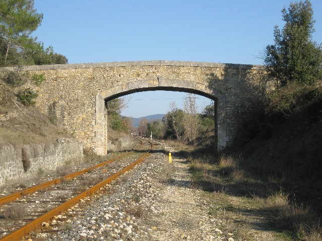 Commentaire photo - Cet ouvrage, tout à fait représentatif de l'architecture anté-PLM mise en oeuvre par les compagnies minières concessionnaires, a été conçu d'emblée pour la double voie, à une époque où personne n'envisageait sans doute un tronc commun entre les lignes Alès - Bessèges (à gauche) et le Martinet - Beaucaire (à droite), vues ici en direction du nord. | |
