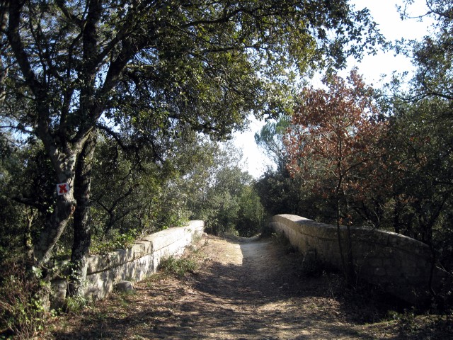 | Commentaire photo - Sur le tablier de l'ouvrage en maçonnerie, des chasse-roues se blotissent toujours contre des parapets tout en rondeur. Ils pourraient resservir un jour. La direction d'Uzès est à gauche. | |
