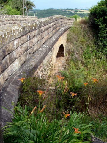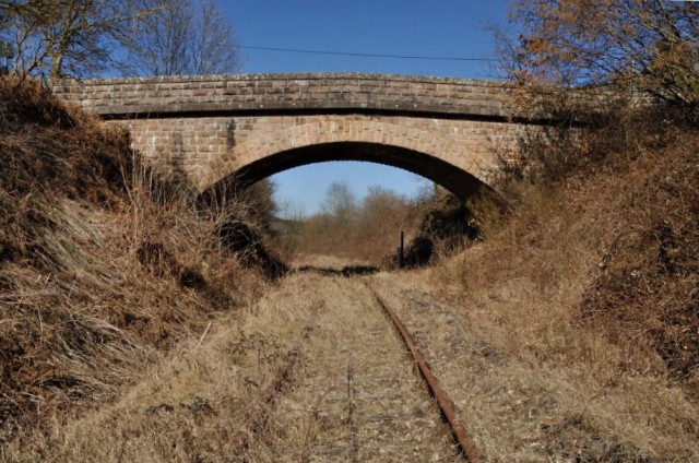 Commentaire image : La végétation, le tablier du pont lui-même, apparaissent rouillés comme les rails. La rouille serait-elle la couleur de l'oubli? La direction de Lapeyrouse est en face. | ![]() |