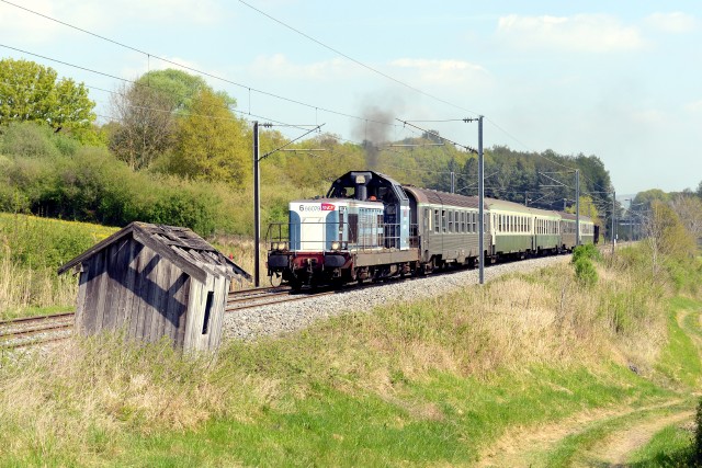 | Commentaire photo - Venant de dépasser le pont de Puy visible au fond, ce train spécial, en provenance du Creusot et à destination de Clermont Ferrand, ne crache pas la fumée souhaitée : c'est en effet la 141 R 420 qui aurait du le remorquer depuis Saint Germain des Fossés. | |