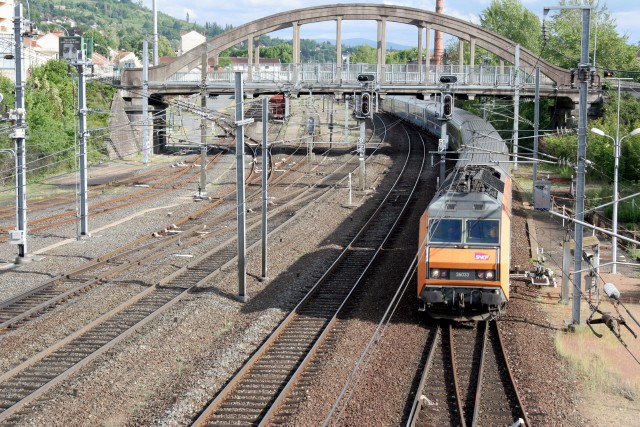 | Commentaire photo - Remorquant un convoi en provenance de Clermont Ferrand, la BB 26000 s'apprête à dépasser la passerelle métallique où le photographe a pris place. | |