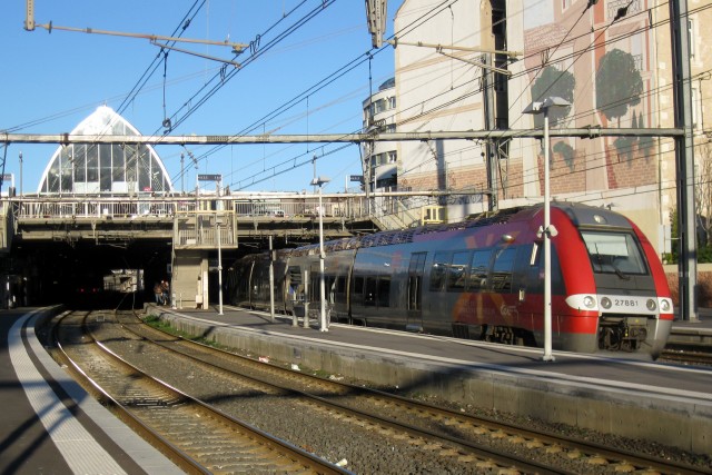 | Commentaire photo - En 2015, l'ouvrage fonctionne comme un parvis "bis", permettant la dépose-minute des voyageurs, soit aux portes de la nef couvrant les voies centrales, soit en haut des escaliers desservant chacun des quais. La direction de Nîmes est au fond. | |