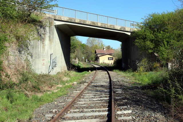 Commentaire photo - Vue vers le nord, la maisonnette du PN 42 apparaît dans son cadre de béton. Le gabarit de la double voie aurait-il été dégagé sur les conseils de quelques "visionnaires" ? | |