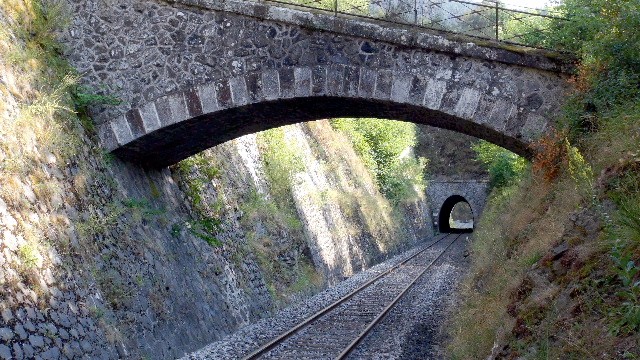 | Commentaire photo - Dans une France, dont les paysages sont peu à peu rongés par d'interminables autant que repoussantes entrées de ville, qui progressivement se rejoignent, cette tranchée ferroviaire offre une perspective aussi rafraîchissante que silencieuse, puisque, depuis des mois, les trains n'y passent plus. Au fond, en direction du sud, on aperçoit le tunnel de Vabres. | |