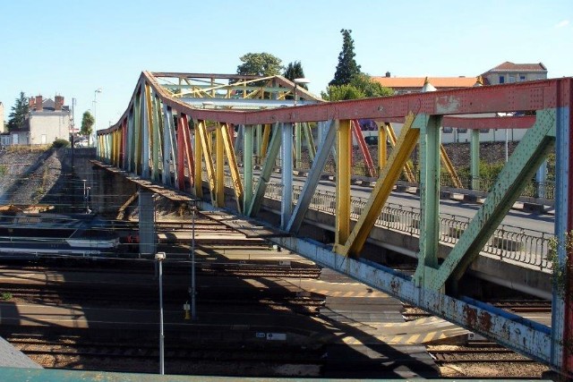 | Commentaire photo - En 1987, une "artiste", sans doute bien en cours, a été autorisée à se lâcher pour donner des couleurs de jouet d'enfant aux poutres métalliques. En 2015, l'"oeuvre", passablement décatie, est à l'image d'une ville plutôt sinistr(é)e. La direction de Châteauroux est à droite. | |