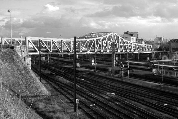 | Commentaire image : Cette vue, côté les Aubrais, est postérieure à 1926, date de l'électrification. A l'origine, le treillis était peint en gris princesse, couleur de la Compagnie d'Orléans. Il fut plusieurs fois repeint en vert clair par la suite. | ![]() |