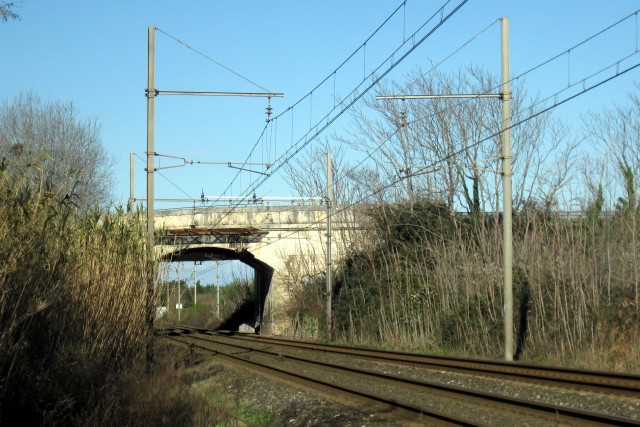 | Commentaire photo - Ce pont ancien a du se substituer très tôt au PN 5, puis a été doublé dans les années 1980, lors de la mise à 2 x 2 voies de l'ex-RN. La direction de Nimes est au fond. L'arc surbaissé a été "grignoté" pour laisser passer la caténaire de la voie paire. | |