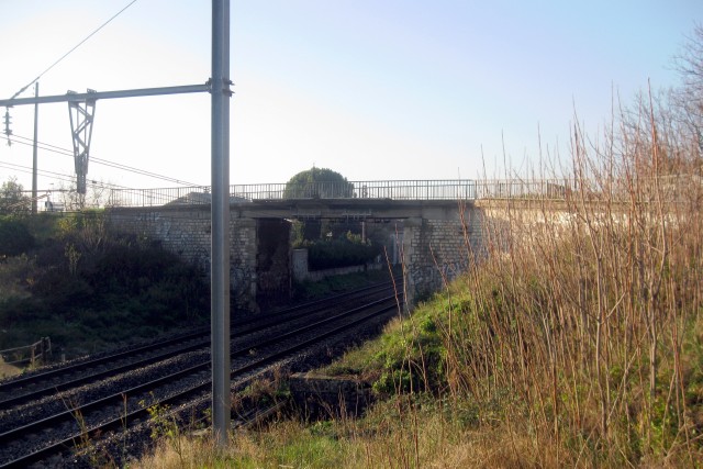 | Commentaire photo - Au premier plan, le talus, qu'apprécient les figuiers, sépare la voie ferrée de la tranchée de l'autoroute A 9, mise en service en 1968 entre Saint Césaire et Gallargues. Les deux itinéraires, souvent proches, sont ici tangents. La direction de Montpellier est au fond. | |