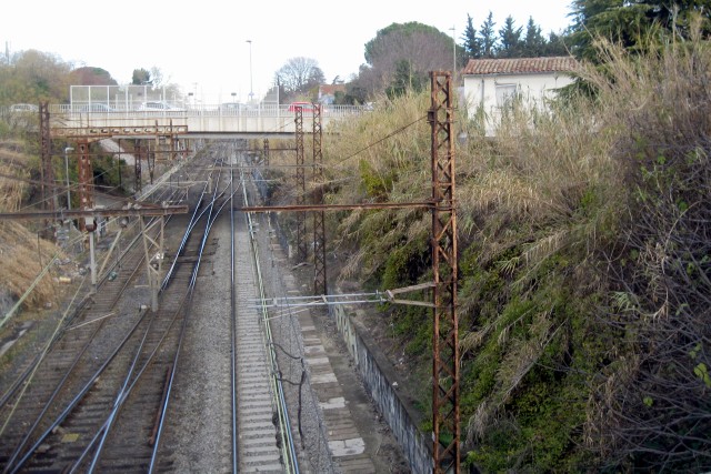 | Commentaire photo - L'avenue Albert Dubout a pris la place en 1977 d'un raccordement des chemins de fer d'intérêt local de l'Hérault, reliant la gare de Montpellier_Chaptal à la ligne de Palavas. Le pont-rail d'origine était métallique. C'est dire que le fameux convoi tout tordu n'est jamais passé par là avec ses personnages drolatiques. Vu en direction de la gare Saint Roch, les aiguillages, héritages de la bifurcation de Paulhan, ne mènent plus qu'au faisceau de remisage des TGV. | |