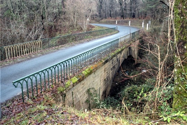 | Commentaire photo - La route franchit une tranchée, partiellement comblée, qui marque le point haut de la ligne, entre la vallée de l'Isle au sud et celle de la Dronne au nord. La direction de Périgueux est à droite. | |