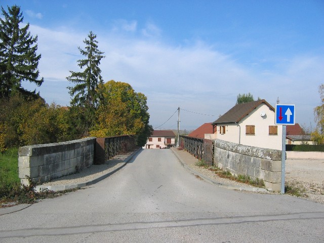 | Commentaire photo - La tranchée, que franchissait l'ouvrage, a été remblayée à cet endroit. Le tablier métallique, toujours encadré par deux culées maçonnées, repose désormais sur le sol. La direction de Dole est à droite. | |