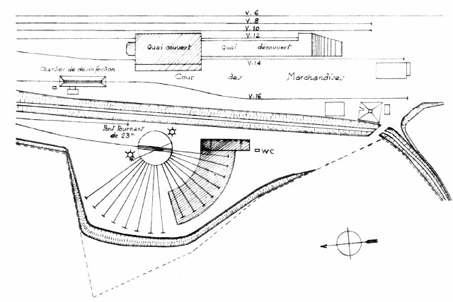 | Commentaire image : Sur ce document de 1941, la voie 16 dessert, de gauche à droite, un chantier de désinfection, le bâtiment des bancs militaires, et une ancienne glacière. Le monde du rail a bien changé depuis. | ![]() |
