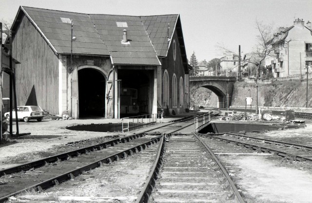| Commentaire image : La modeste rotonde de Mende abrita jusqu'en 1936 les dernières 032 T Engerth à train articulé, construites dans les années 1850. On observe que la travée de droite a été "bricolée" pour tenir compte de la longueur imprévue d'un matériel, peut-être de déneigement. | ![]() |