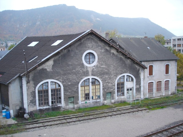| Commentaire photo - Le Causse de Mende, au fond, vers le sud, domine l'ancien dépôt de la Compagnie du Midi. La modeste rotonde fait toujours office de magasin, tandis que le bâtiment accolé abrite encore un foyer. Le BV se situe vers la droite. | |