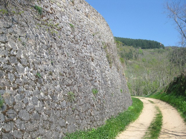 | Commentaire photo - Si les murs de soutènement sont omniprésents dans les vallées du Doux et de l'Eyrieux et contribuent à donner son caractère au réseau du Vivarais, ils ne sont pas rares entre Lamastre et le Cheylard. Ici, la D 578 surplombe la plate-forme du chemin de fer, vue en direction de Lamastre. | |