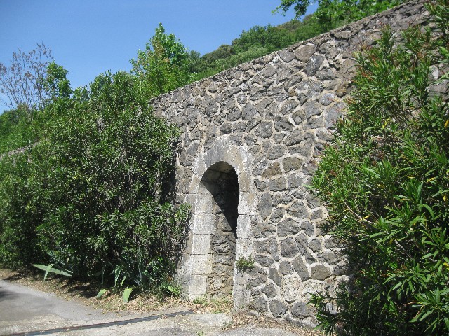 | Commentaire photo - A Saint Jean de Valériscle, ce mur de soutènement domine l'ancienne cité minière de la Nougarède, située sur l'autre rive de l'Auzonnet. Malheureusement, bien qu'il ait fait au mois d'avril aussi chaud qu'au mois de juin, les lauriers ne sont pas encore fleuris. Quel dommage ! La direction du Martinet est à gauche. | |