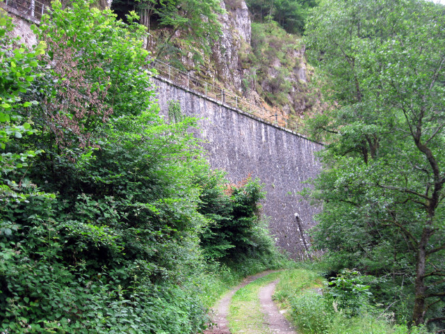 | Observations - Tout au long des Gorges de la Cère, les murs de soutènement surmontés de garde-corps métalliques, et supportant la plate-forme, sont au nombre de 71, cumulant une longueur de 5.123 m. Les murs de soutènement dominant la voie sont, quant à eux, au nombre de 226, pour une longueur de 10.800 m. Ces murs sont donc présents sur la moitié du parcours ! | |