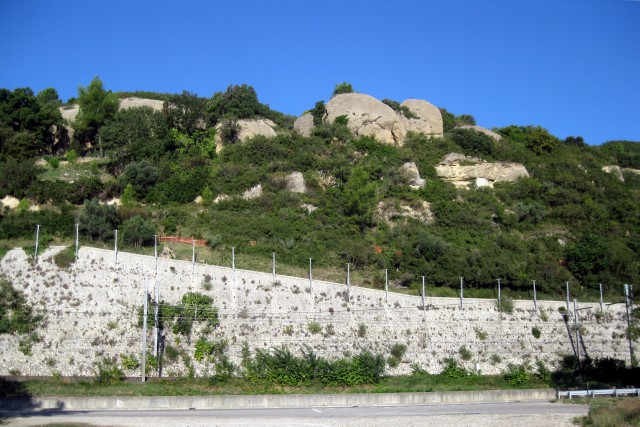 | Commentaire photo - Le Rhône voisin a drossé la voie ferrée contre la colline des Perrières, au nord de Villeneuve lès Avignon. Emergeant de la végétation méditerranéenne, d'inattendus blocs de grès surplombent le mur de soutènement. Les poteaux-caténaires donnent l'échelle. La direction de Nîmes est à gauche. | |
