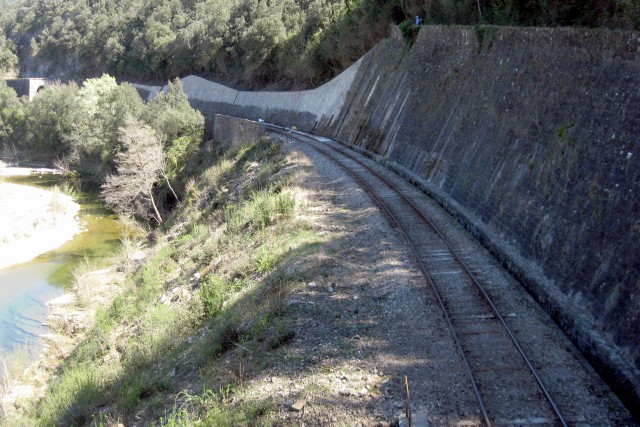 | Commentaire photo - Trop souvent à l'ombre, ce mur de soutènement, qui domine une boucle serrée du Gardon, est en cours de "ravalement" : les maçonneries sont entièrement reprises, renforcées et rejointées. Ces travaux, ainsi que la "dévégétalisation" des abords de la voie, sont portés par Alès Agglomération et redonnent à la voie ferrée son apparence originelle. Tout au fond, on apercoit la galerie voûtée du Malpas, qui prolonge, côté Saint Jean du Gard, le souterrain de la Salindrinque. | |