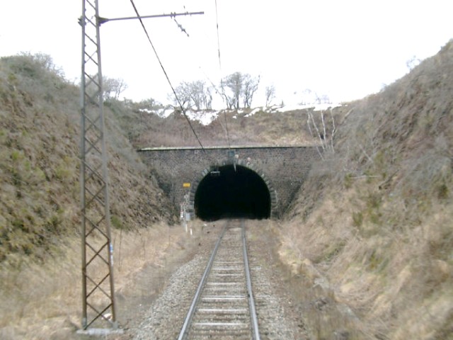 Commentaire photo - Débouché côté Saint Flour : noter le gabarit double voie. Cette photo a été prise depuis la voiture de queue du premier Aubrac 5941 Paris - Béziers circulant sur la ligne des Causses depuis l'accident du même train le 25 février 2006. Deux puits d'aération sont repérables depuis la D 679. | |