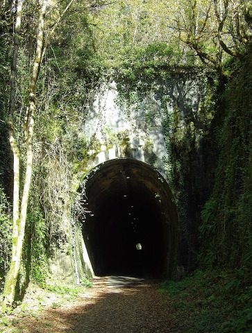| Commentaire photo - Le souterrain, éclairé, abrite désormais une voie verte. Des arceaux métalliques le consolident par endroit. On voit ici son portail côté Sarlat. | |