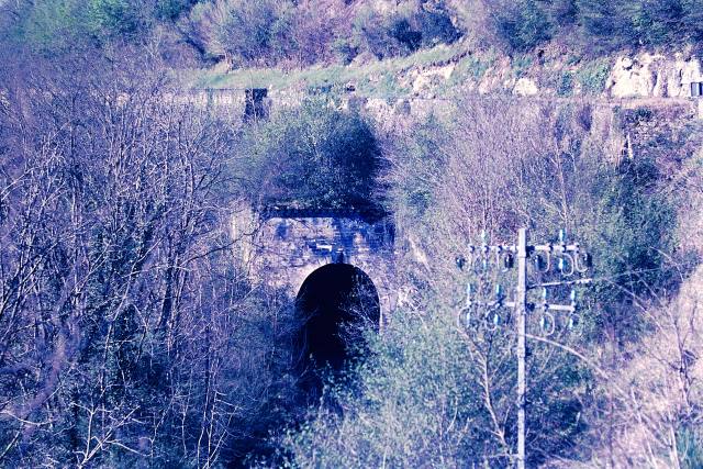 | Commentaire image : En avril 1988, la ligne était déjà inexploitée depuis huit ans. La D 703 offre un second couronnement à la tête du tunnel, côté Souillac. Repère de nivellement :87,809 m. |
